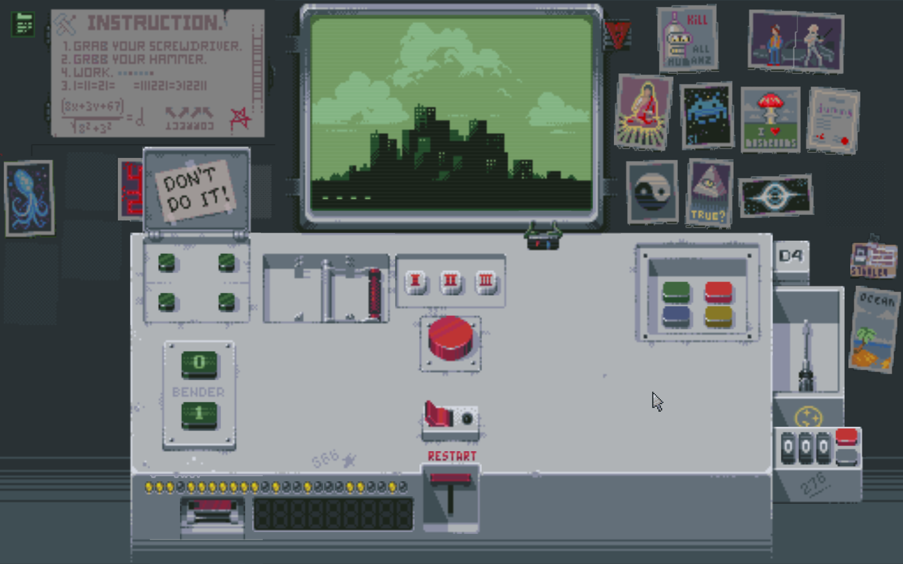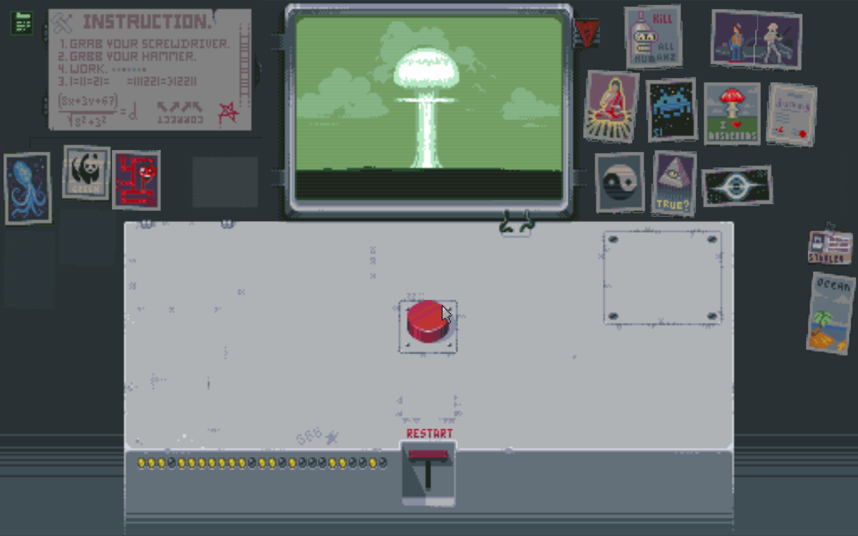Your co-worker needs to take a leak, and they just ask you to stand guard in front of this strange machine, but asks you to not touch anything. What do you do? Well, you could do what you're told and not touch anything, which will net you one of 25 different endings. Or you could give in to your curiosity, press that big red button, flip the switch, press the button again... and nuke the city that is ominously being shown on the monitor. Or you could press the button a bunch of times, revealing screwdrivers, hammers, or Roman numerals, which when pressed correctly leads to the opening of even more panels and buttons. Ultimately it's a puzzle game of figuring out what they all do and the game encourages you to press everything. It's very simple but clever - most of the solutions are right on the screen, but it's just a matter of figuring out what that random stuff means.